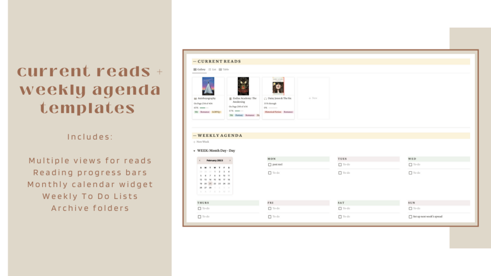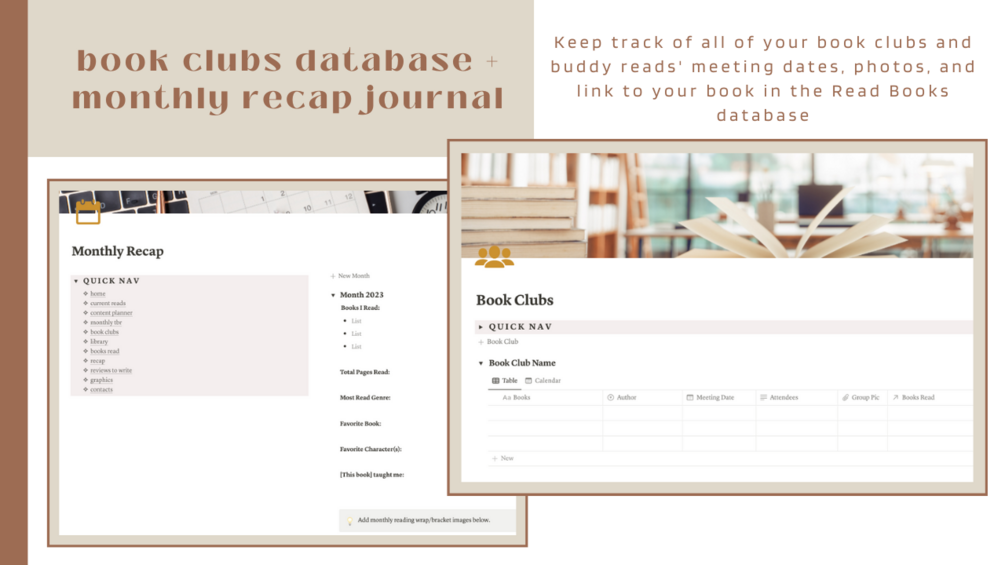 - One-click pre-made templates for monthly trackers, recaps, TBR lists and book club databases.